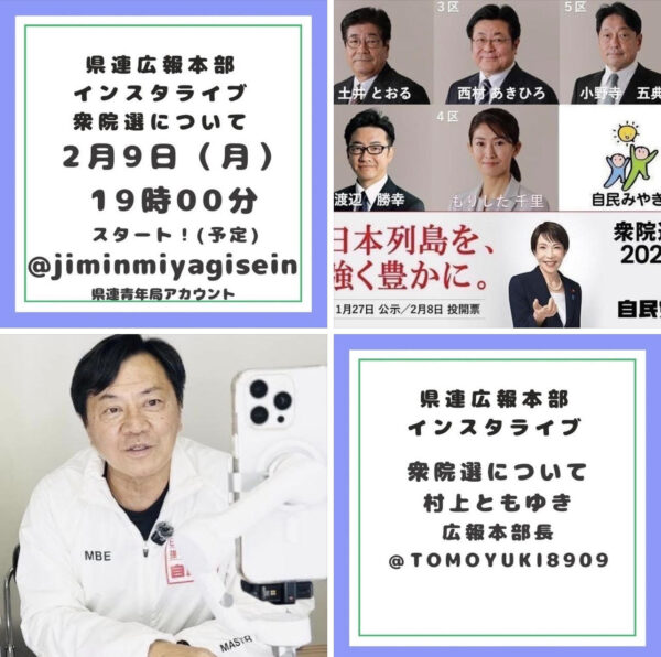 『県連広報本部インスタライブのお知らせ 衆院選について 2/9(月)19:00配信(予定) 』