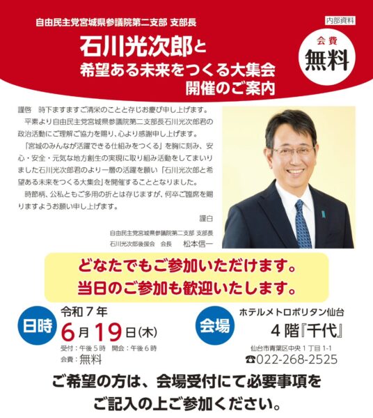 ◤石川光次郎と希望ある未来をつくる大集会◢ のご案内(自由民主党宮城県参議院第2支部より)(内部事務連絡)