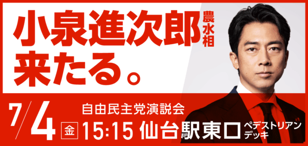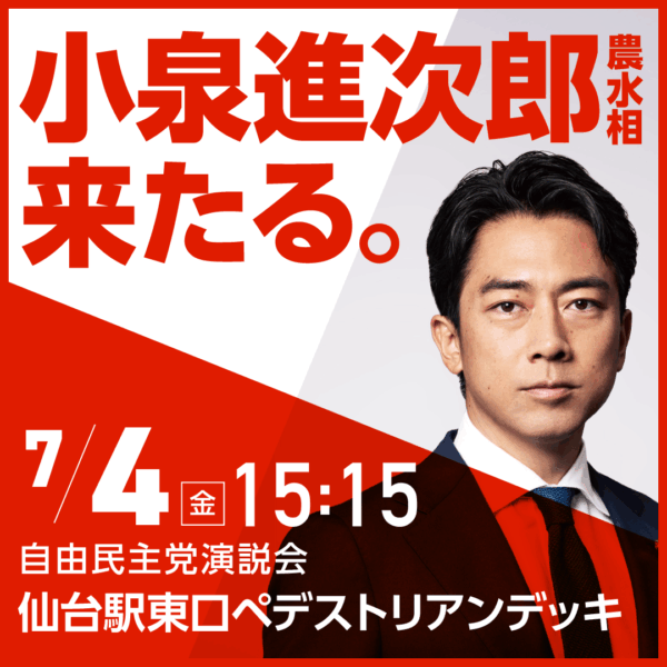 『小泉進次郎 農林水産大臣来たる。 自由民主党街頭演説会 石川光次郎 応援!‐ 7/4(金)15:15 仙台駅東口ペデストリアンデッキ -』