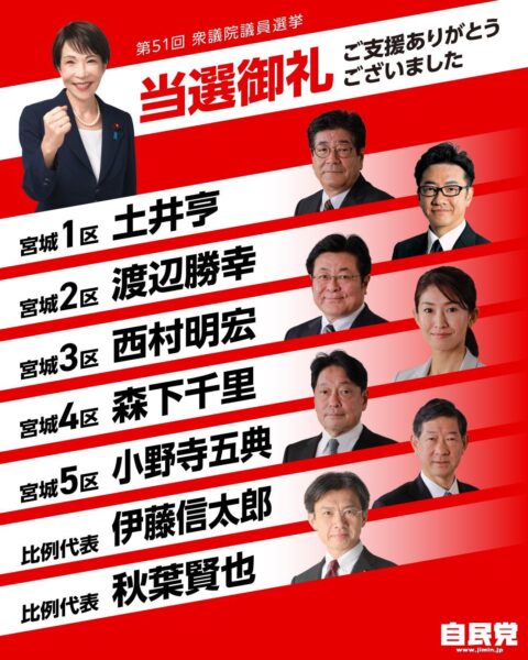 今後は、高市早苗総裁のもと、今般当選させていただきましたわが党候補ともども、